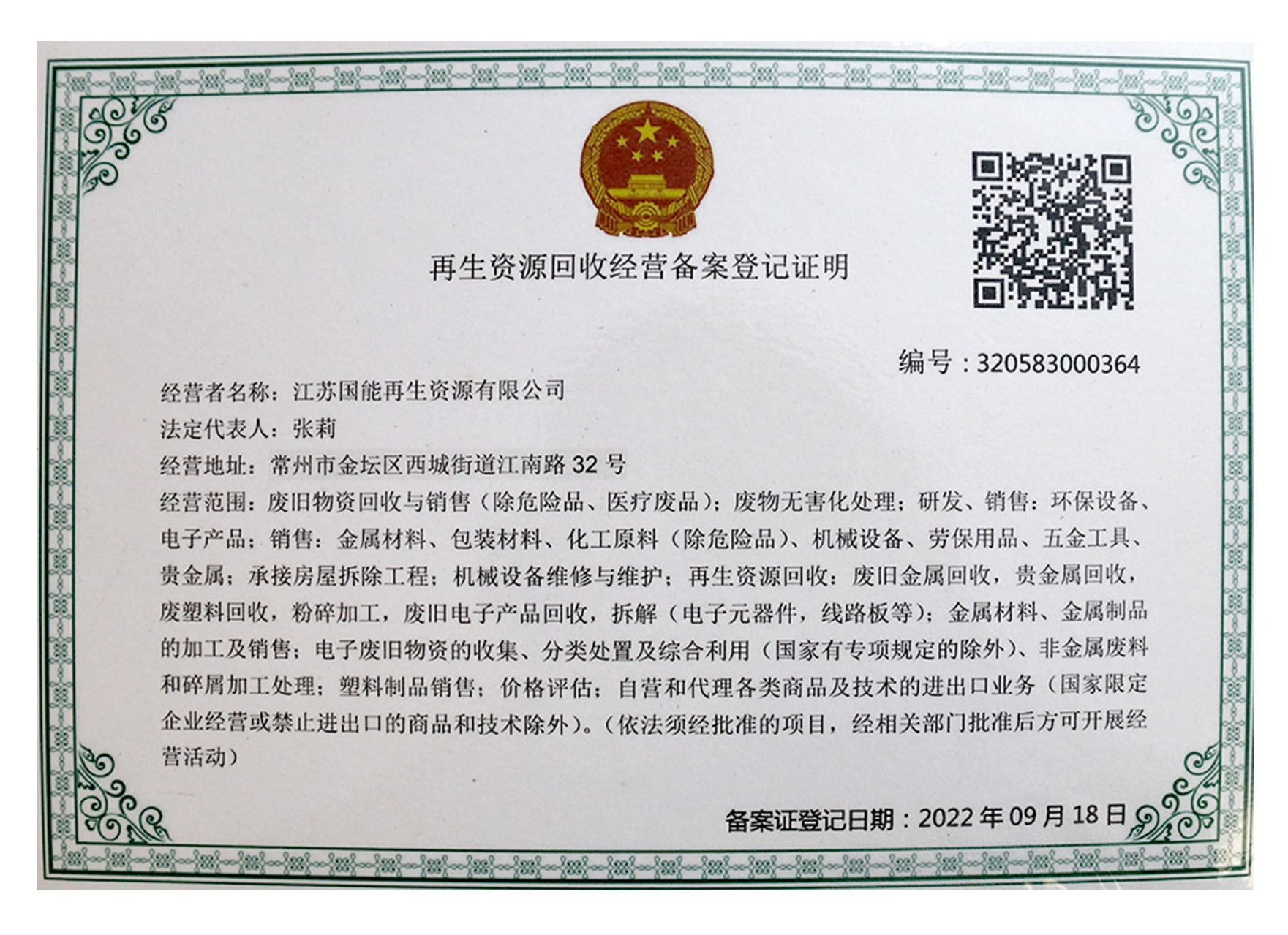 再生资源回收经营备案登记证明